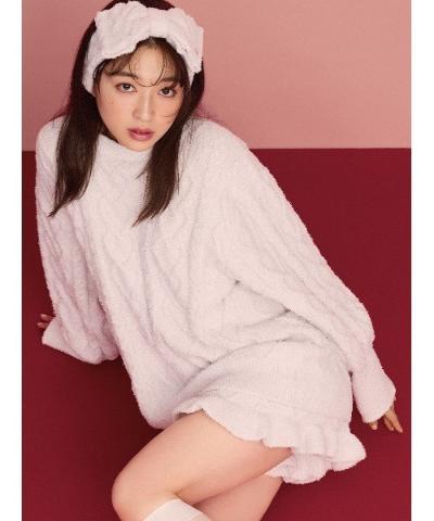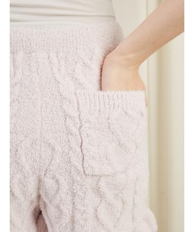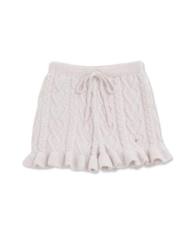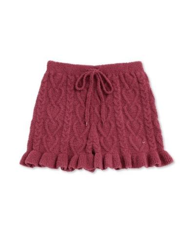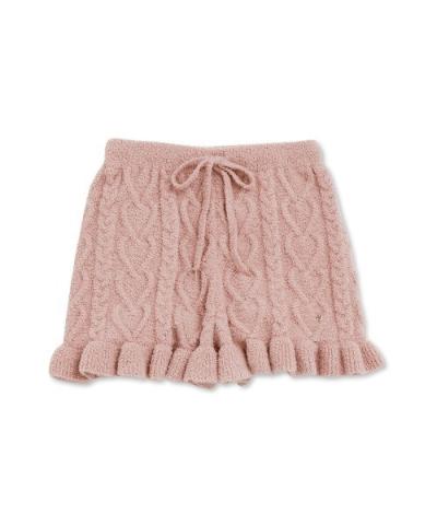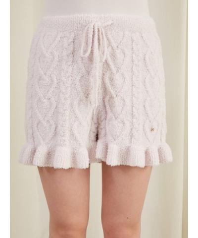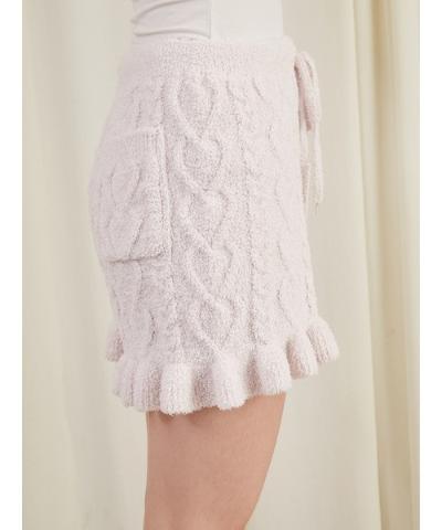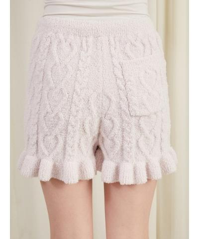 표면 전체에 땋은 사랑스러운 하트 패턴이 있는 Aran 니트 쇼츠는 밑단에 프릴이 있는은 여성스러운 디자인입니다.