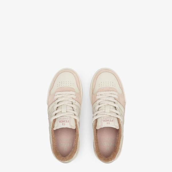 <h3>제품 설명</h3> Fendi Match compact design sneakers with vintage label on tongue. Branded with FF pattern sewn on the side and embossed Fendi lettering on the sole. Made of pink suede with white leather details. Embellished with tone on tone terry collar and laces. Covered rubber cupsole with light beige bumper. The style includes a second pair of white terry laces. Made in Italy