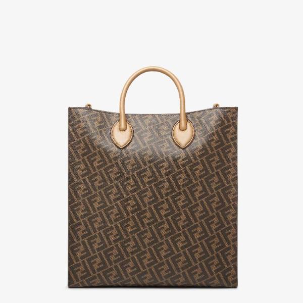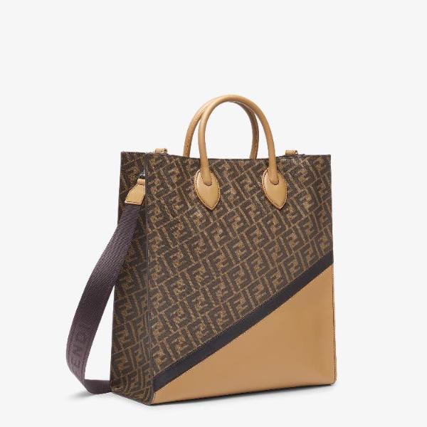 <h3>제품 설명</h3> Shopper made of brown leather and brown FF motif fabric. Lined interior, black leather diagonal inserts, zip pocket and palladium-finish metalware. The fabric cross-body shoulder strap with FENDI lettering is adjustable and detachable. Made in Italy