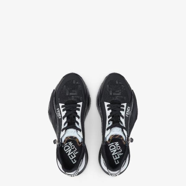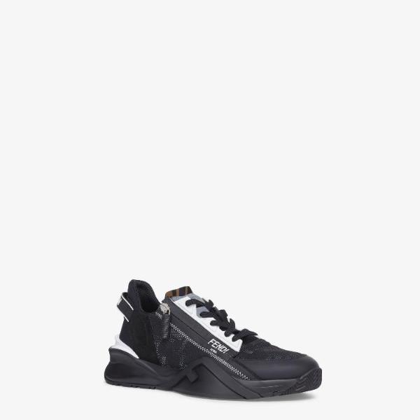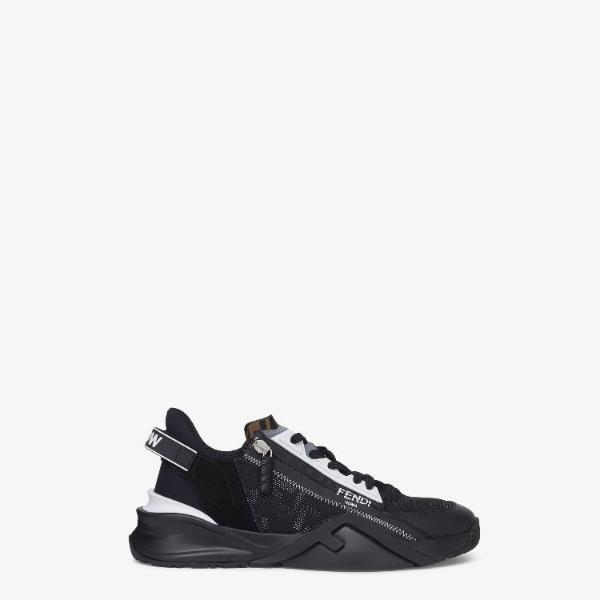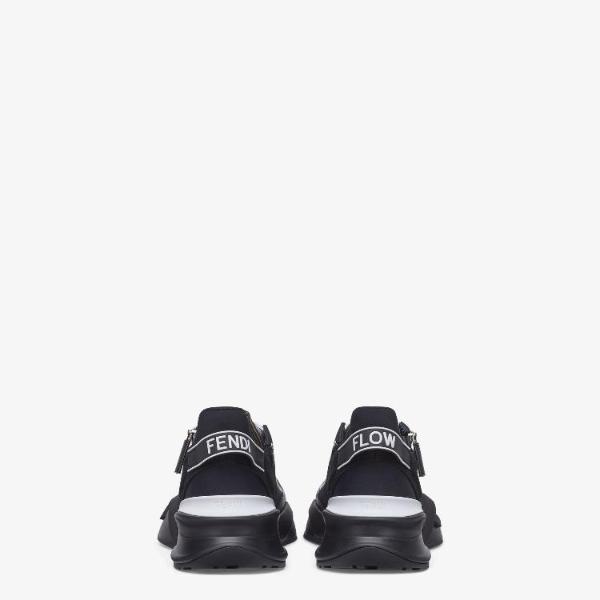 <h3>제품 설명</h3> Slip-on sneakers with adjustable elasticated laces, side zip and corrugated sole with engraved F. Fendi Flow lettering embossed on the heels. Made of black regenerated nylon with FF jacquard motif and black suede details. Embellished with a LYCRA tongue with FF motif. Sole in lightweight white rubber with black diagonal F detail. Made in Italy